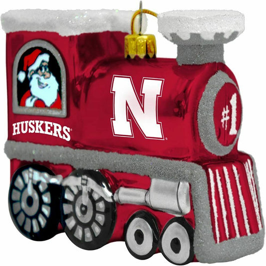 TS NCAA Nebraska Cornhuskers Blown Glass Santa & Rudolph Train Ornament